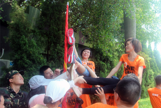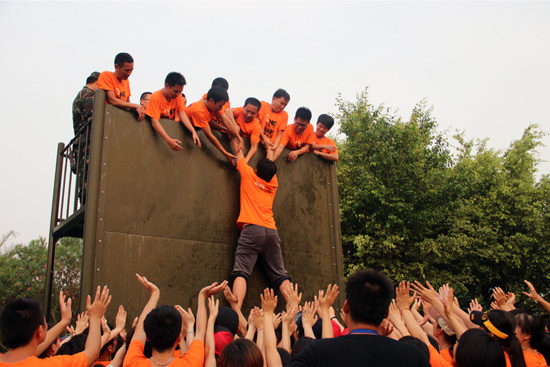 這兩個項目完成后,我們的大團隊來到了操場,拍了集體照,各個公司和各個小隊也分別拍了照片。隨著留影紀念結束,最后一個項目,也是讓人印象最深刻的一個項目到來了。畢業(yè)墻,也叫“夢想之墻”。所有人,不能借助任何道具,單純依靠身體的力量,要全部爬上4.7米高的鐵墻。一馬當先的隊員、甘當人柱的隊員、奮力抓取的隊員、默默守護的隊員和幾乎沒有任何可以依靠的最后一名隊員。每個人都在這個項目里找到了自己的角色,并順利地完成了自己的使命。當最后一名隊員——黃永星童鞋爬上了夢想墻后,歡呼聲、鼓掌聲頓時響徹每個人耳邊。