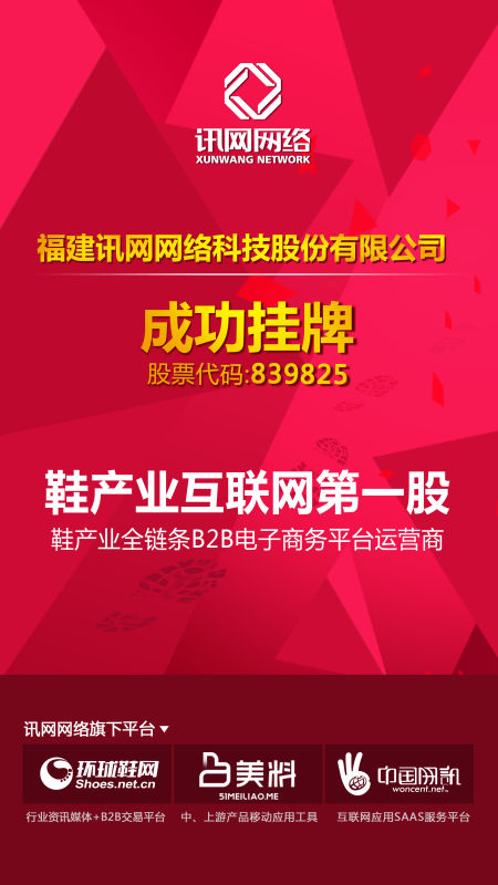 此次訊網(wǎng)網(wǎng)絡(luò)掛牌,正式成為國內(nèi)鞋產(chǎn)業(yè)互聯(lián)網(wǎng)“第一股”,彰顯了公司作為鞋行業(yè)互聯(lián)網(wǎng)資訊第一平臺、B2B在線交易領(lǐng)先平臺的行業(yè)地位。下一步,公司將利用供給側(cè)改革、制造升級、B2B電商風(fēng)口等發(fā)展機(jī)遇,以“經(jīng)緯鑄球,閉環(huán)生態(tài)”為業(yè)務(wù)架構(gòu),打通鞋行業(yè)上中下游企業(yè)及產(chǎn)品這一用戶“經(jīng)線”,建立企業(yè)專業(yè)資訊、在線交易、供應(yīng)鏈金融、數(shù)據(jù)服務(wù)這一業(yè)務(wù)“緯線”,開放聯(lián)結(jié),構(gòu)建起連接鞋企一切互聯(lián)網(wǎng)需求的電商生態(tài)圈。