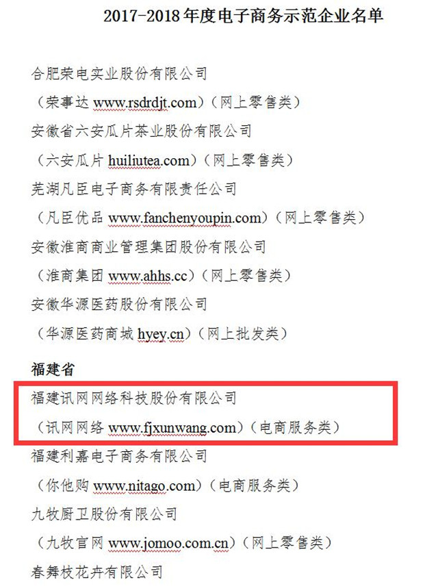 日前,訊網(wǎng)網(wǎng)絡(luò)與阿里巴巴、京東、小米等239家知名企業(yè)共同入選國家商務(wù)部公布的《2017-2018年度電子商務(wù)示范企業(yè)》名單,且成為福建省唯一連續(xù)四次獲得此項國家級重要榮譽(yù)的企業(yè)。