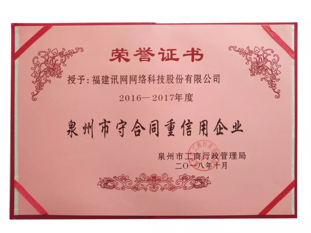 日前,2016-2017年度泉州市守合同重信用企業名單正式揭曉,福建訊網網絡科技股份有限公司(簡稱“訊網網絡”)蟬聯泉州市守合同重信用企業。