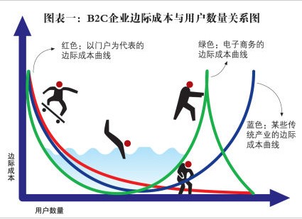 與門戶等互聯(lián)網(wǎng)產(chǎn)業(yè)一樣,B2C產(chǎn)業(yè)特征是典型的邊際成本先下降再上升,然后再下降的反微笑曲線(如下頁(yè)圖表所示)。無(wú)論是水漲船高的網(wǎng)絡(luò)推廣費(fèi)用,抑或是讓各家B2C企業(yè)坐如針氈、日益高昂的客戶獲取成本,B2C企業(yè)之爭(zhēng)已經(jīng)從原有的“野蠻式生長(zhǎng)”的陣地戰(zhàn),過(guò)渡到了今日的“搶人戰(zhàn)”。